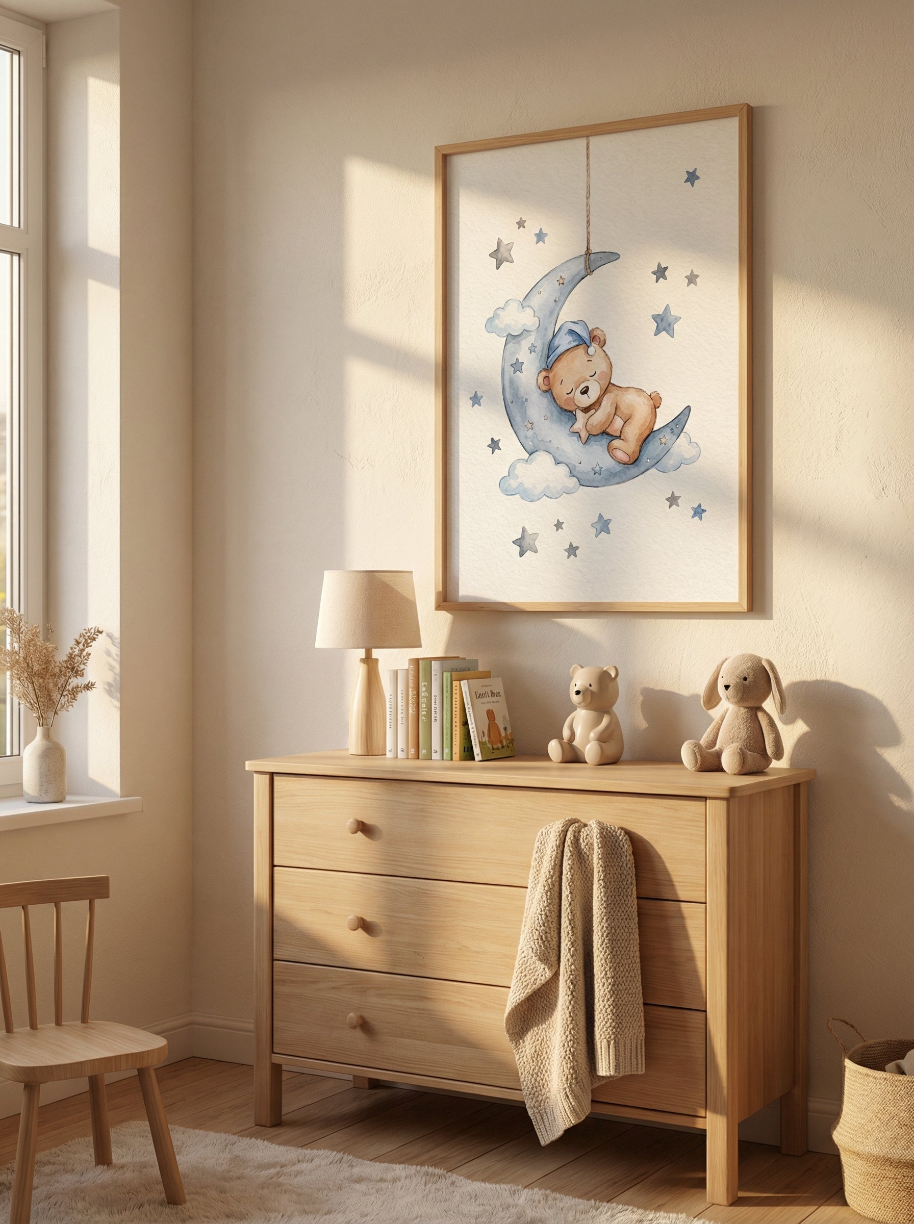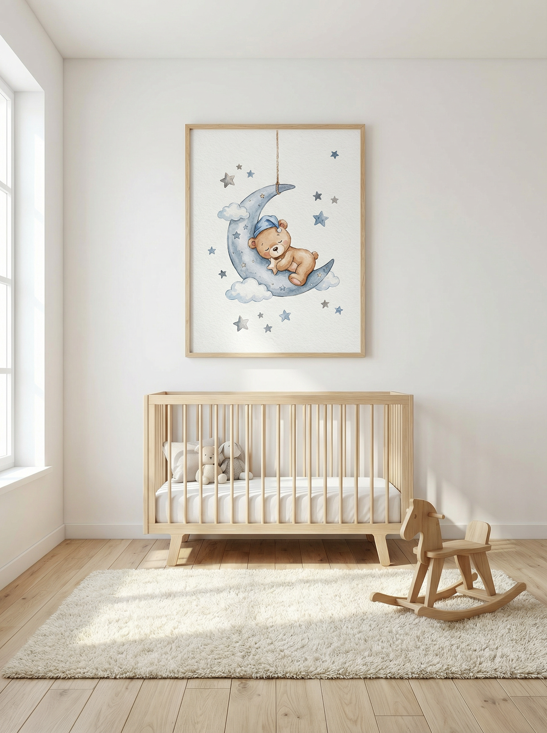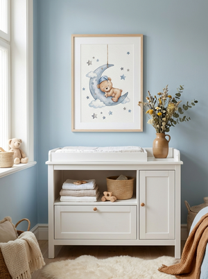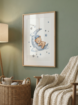 Verwandle das Kinderzimmer in eine traumhafte Sternenwelt. Unser Poster mit dem schlafenden Bären auf dem Mond ist die ideale Ergänzung für eine liebevolle Wandgestaltung, die Geborgenheit und Ruhe ausstrahlt. Auf diesem hochwertigen Motiv ruht ein kleiner Teddybär in sanften Brauntönen auf einer pastellblauen Mondsichel. Begleitet von verspielten Wolken und einem sanften Sternenregen, fängt die Illustration den Moment des tiefen Schlummers perfekt ein. Die feinen Wasserfarben-Details und die harmonische Farbwahl in Blau und Grau sorgen für einen zeitlosen Look. Ob zur Geburt oder einfach als neues Highlight im Spielzimmer – dieses Bild schafft eine beruhigende Umgebung für tägliche Abenteuer und nächtliche Erholung. Es lässt sich wunderbar mit Holzmöbeln und hellen Textilien kombinieren, um einen modernen und einladenden Raum für dein Kind zu gestalten.